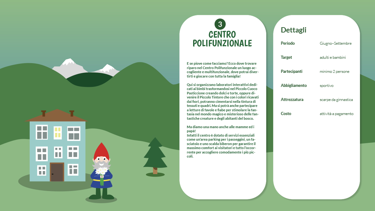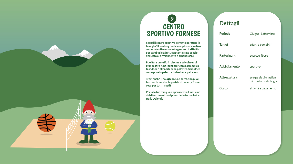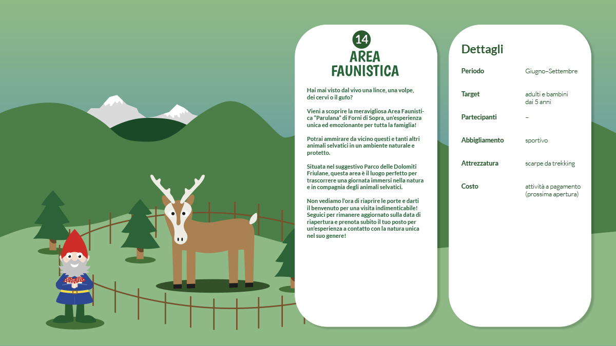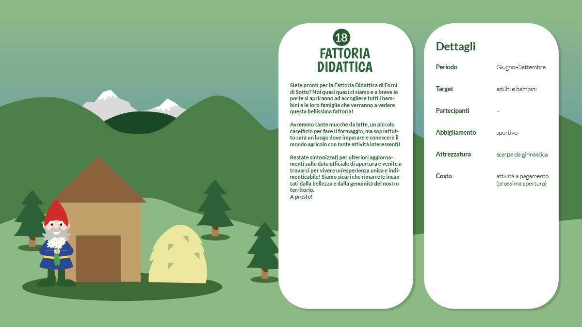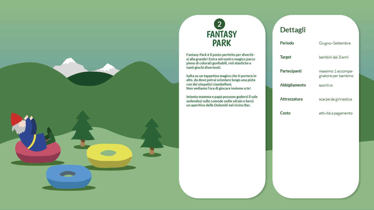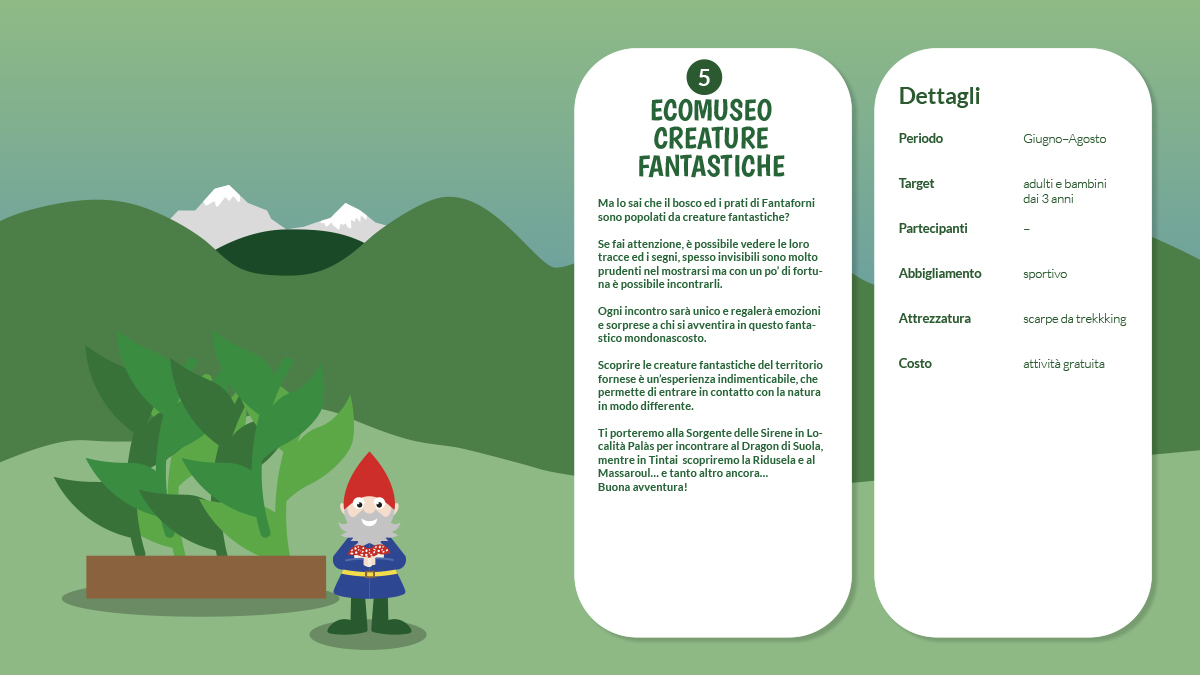 FantaForni è un compendio di “esperienze turistiche ludico-ricreative ed educative” rivolte al target family (bambini dai 3 agli 11 anni). Un Parco giochi e divertimento per i bambini all’aperto, in un ambiente naturale ed incontaminato, per ampliare e valorizzare ulteriormente l’offerta turistica esperienziale ed innovativa a basso impatto.